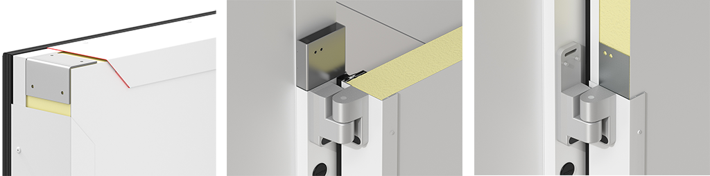 Закладные элементы под петли обеспечивают их надежное крепление и распределение нагрузки от веса полотна.Эксцентриковые петли из ударопрочного пластика и с регулировкой в трех плоскостях обеспечивают герметичное прижатие уплотнителя к раме.
